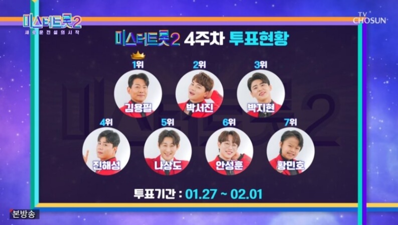 - 결과발표 : 한 주동안 집계된 투표 현황을 집계해서 다음 주 방송에서 결과를 발표 합니다.